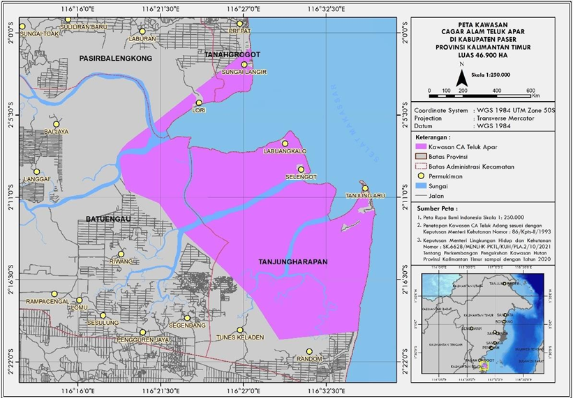 Pada tahun 2021, berdasarkan Surat Keputusan Menteri Lingkungan Hidup dan Kehutanan Nomor SK.6628/MENLHK-PKTL/KUH/PLA.2/10/2021 tanggal 27 Oktober 2021 tentang Peta Perkembangan Pengukuhan Kawasan Hutan Provinsi Kalimantan Timur sampai dengan Tahun 2020, terdapat perubahan luasan kawasan Cagar Alam Teluk Apar. Perubahan tersebut terutama disebabkan oleh enklave pemukiman-pemukiman yang berada di dalam kawasan, sehingga secara spasial luas CA Teluk Apar menjadi ±49.195,22 ha. Pada Amar Ketiga Surat Keputusan tersebut ditetapkan bahwa peta perkembangan kawasan hutan menjadi acuan dalam penentuan peruntukan dan fungsi kawasan hutan di Provinsi Kalimantan Timur.