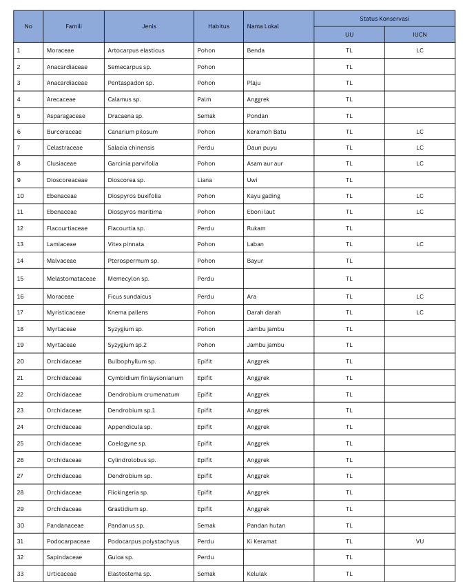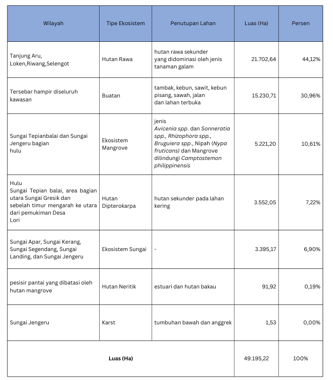 Terdapat 7 (tujuh) tipe ekosistem di Cagar Alam Teluk Apar. berikut ini merupakan data luas tipe ekosistem dengan jenis keanekaragaman hayati penutupan lahannya.